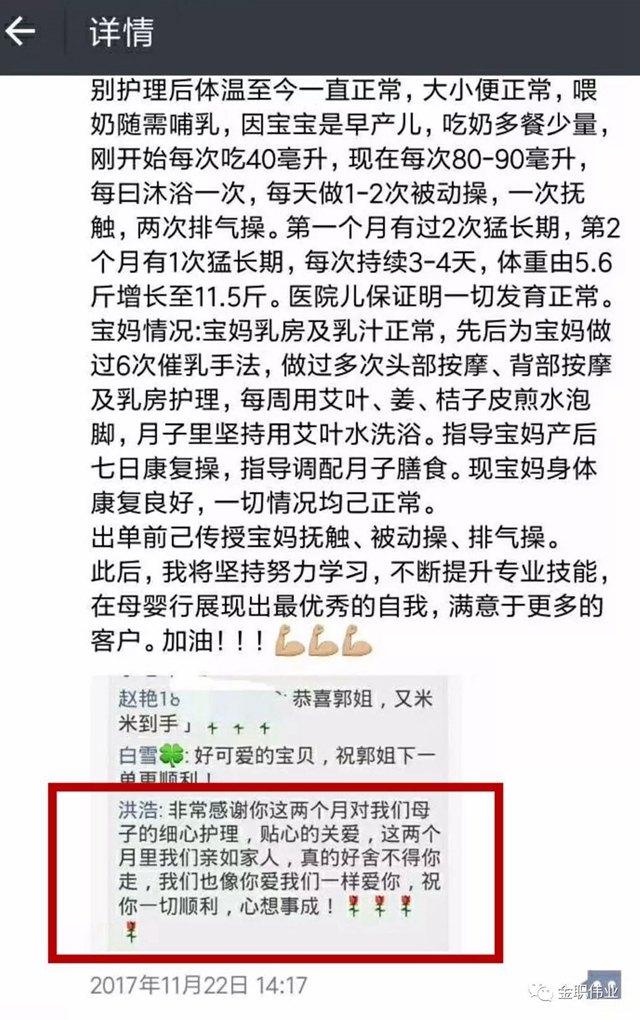 聊到未來規(guī)劃,郭仙其表示自己也沒有過多的考慮,就想做好每一單。起初只是當(dāng)一份工作來完成,每天起早貪黑,甚至通宵達(dá)旦地照顧寶寶,也會覺得累,但是每當(dāng)看見寶寶沖著自己笑,就感覺什么累都不存在,像照顧自己的孫子一樣,充滿了一種難以名狀的滿足感。雖然小編無法切身感受到,但是能想象到那溫暖的畫面,一定是因?yàn)楣善浒l(fā)自內(nèi)心地喜歡寶寶,才能讓客戶如此滿意吧!