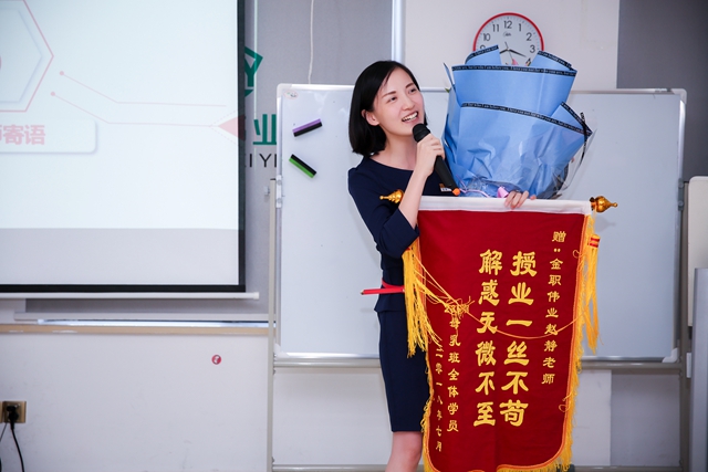 隨后,金職偉業(yè)學校月嫂講師魯賽艷老師、羅婭嫻老師、催乳師講師趙靜老師分別致辭,給予學員們真誠祝福和殷切期望。學員們感動于老師們的良苦用心與辛勤付出,送上鮮花與擁抱以示感謝,催乳師班的學員更是準備了一面錦旗贈予趙靜老師。