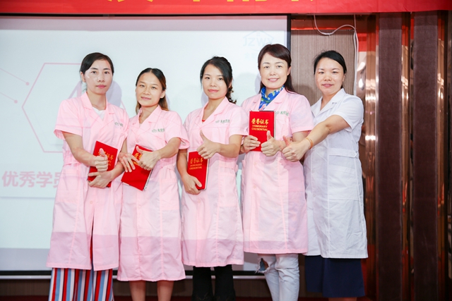結業典禮上還表彰了優秀班干部、優秀學員。班長李艷蘭是此期優秀班干部的獲得者;學員胡蓉、鄧娜、胡紅霞分別獲得優秀學員。她們紛紛走上臺接過學校頒發的榮譽證書,并發表了獲獎感言及學習感受。