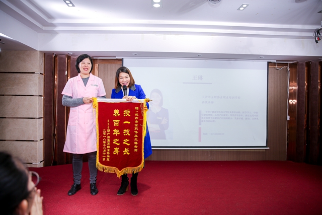 在王琳老師發(fā)言結(jié)束后,班長雷曉慧代表262期全體產(chǎn)后康復(fù)班學(xué)員為王琳老師送上錦旗,并感謝王琳老師17天來不辭辛苦的教導(dǎo)。