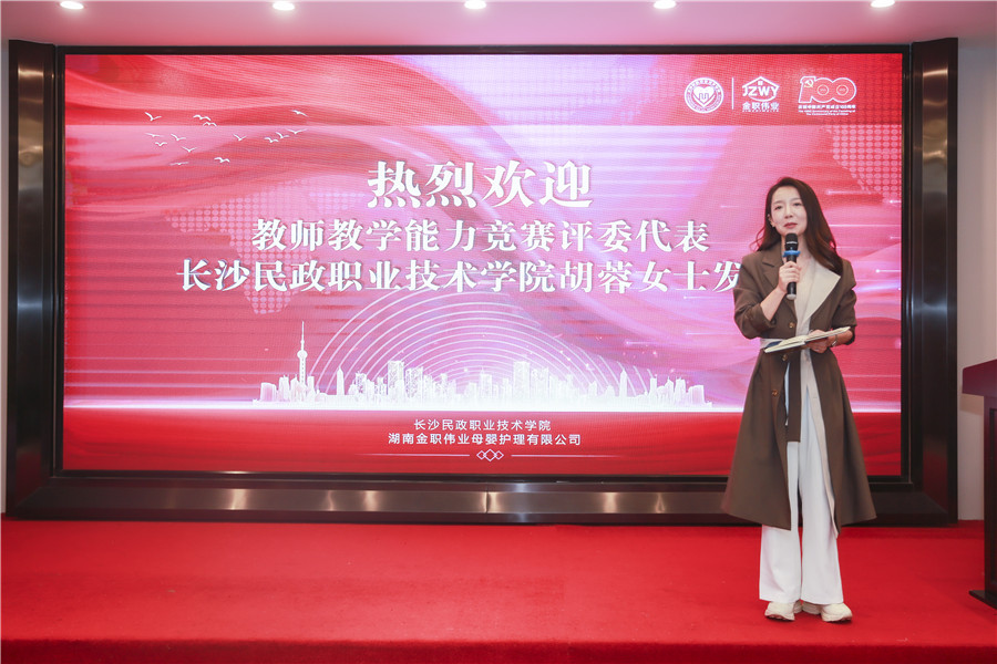 湖南省教育考試院藝術類考試評委庫專家、長沙民政職業技術學院教學咨詢與指導團隊專家胡蓉,作為評審專家對參賽團隊表現做出點評,她提到兩點,第一,電子信息技術的合理應用。如在教學過程中可以融入虛擬標準化病人,在教學中購置相關儀器保證抽象事物的可視化進行;第二,實訓環節可以讓學生有沉浸式的體驗,比如可以去產后恢復機構實地見習,在產婦不反感的情況下獲取評價以達到查缺補漏的目的等。