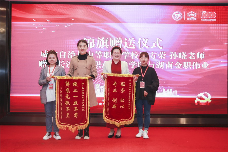 緊接著,學員代表威寧自治縣中等職業學校耿方榮老師,孫曉老師為長沙民政職業技術學院、湖南金職偉業母嬰護理有限公司贈予錦旗,感謝金職偉業和長沙民政職業技術學院共同搭建的優秀培訓平臺和優質教學資源。同時,現場為本期優秀班干部、優秀學員以及教師教學能力競賽特聘專家評委頒發證書。
