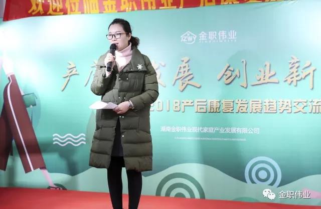 會上,首先由金職偉業(yè)董事長彭英女士致歡迎詞,并作金職偉業(yè)2017年度工作匯報。她代表金職偉業(yè)對各位領導和嘉賓的到來表示熱烈歡迎和衷心感謝。2017年,金職偉業(yè)在母嬰職業(yè)培訓、母嬰健康服務、研發(fā)創(chuàng)新等方面的努力獲得了業(yè)界的肯定,榮獲了“湖南省家庭服務職業(yè)培訓省級示范基地”、“高校畢業(yè)生最佳用人單位”、“長沙市創(chuàng)新創(chuàng)業(yè)帶動就業(yè)示范項目”等榮譽,而榮譽只代表過去,新的挑戰(zhàn)正在等待著我們。對于今后3年的發(fā)展,金職偉業(yè)的目標是——開設100所母嬰職業(yè)培訓分校和500家一站式母嬰健康服務體驗館。她表示,母嬰健康是前途遠大、前景廣闊、大有可為的事業(yè),金職偉業(yè)人必須堅守這個夢想,才能將“讓千萬婦幼老實現(xiàn)健康幸福生活”的使命踐行到底,才能造福于千千萬萬產(chǎn)后媽媽和寶寶。