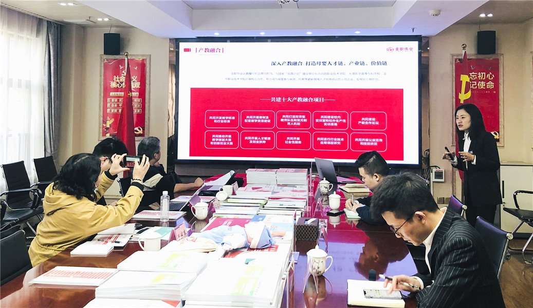 座談會上,金職偉業董事長助理兼品牌運營總監周娟就公司整體戰略布局、公司榮譽、業務版塊發展具體情況以及在1+X證書推進工作中取得的成果作了詳細介紹。