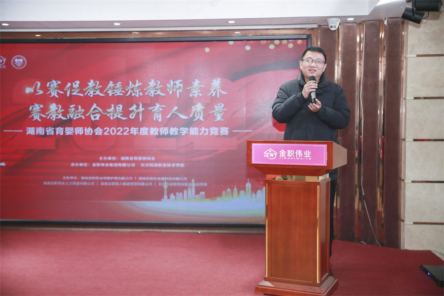 為進(jìn)一步在1+X幼兒照護(hù)、產(chǎn)后恢復(fù)職業(yè)技能等級證書教師隊伍中,樹立一批教學(xué)思想先進(jìn)、教學(xué)基本功過硬、教學(xué)方法靈活得當(dāng)、教學(xué)成績突出的優(yōu)秀典型,激勵教師不斷更新教學(xué)觀念,積極進(jìn)行教學(xué)改革,努力提升教學(xué)水平,大幅度提高教學(xué)質(zhì)量,進(jìn)而提升育人質(zhì)量,2022年1月20日,湖南省育嬰師協(xié)會2022年度教師教學(xué)能力競賽順利舉行,本次競賽由湖南省育嬰師協(xié)會主辦,金職偉業(yè)集團(tuán)有限公司、長沙民政職業(yè)技術(shù)學(xué)院承辦。