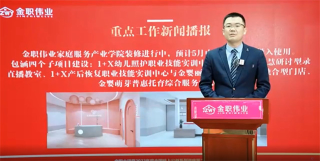 金偉業集團有限公司總經理助理兼院校事業部總監周該生作為主持人就近期工作作了簡單匯報,其中,他重點提及幼兒照護、產后恢復、醫養個案管理、健康財富規劃職業技能等級證書試點申報情況,“幼兒照護、產后恢復、醫養個案管理、健康財富規劃證書截至2022年4月28日,已完成申報省份14個,正在申報省份13個,待申報省份4個,共計申報人數為12.5萬人。”