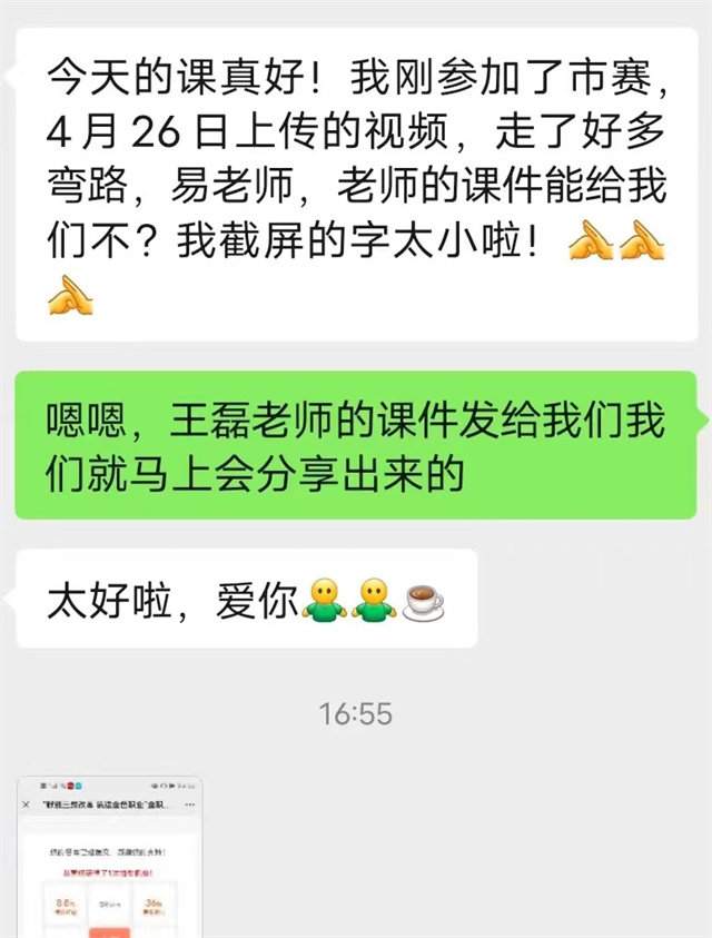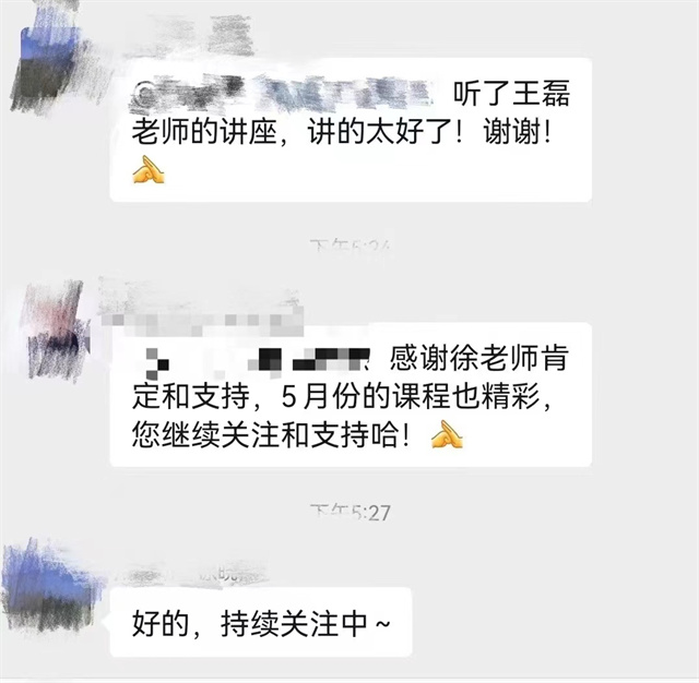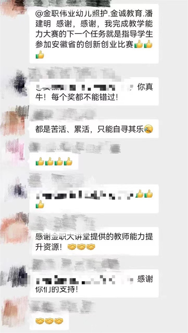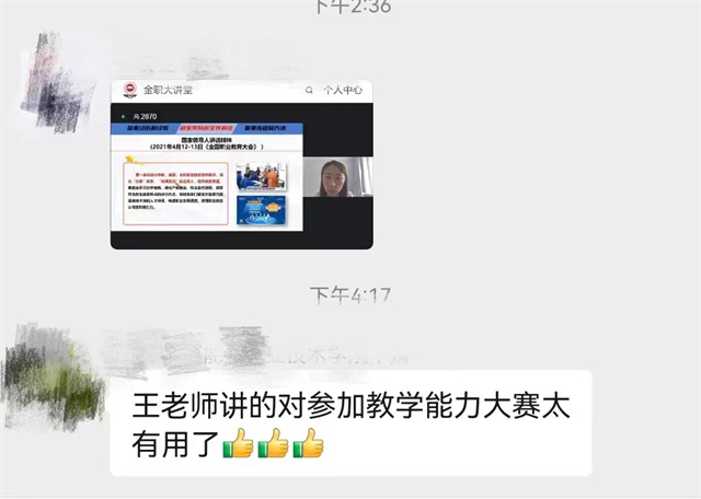 課程結束后,參訓老師們紛紛表示此次課程內容精彩,干貨滿滿,“此次課程教學內容明晰,給了我許多參賽靈感。”“感謝金職大講堂提供的教師能力提升資源!”“之前參加比賽走過很多彎路,此次王磊老師的分享讓我受益匪淺!”“老師的課程太有用了,希望金職大講堂越辦越好。”