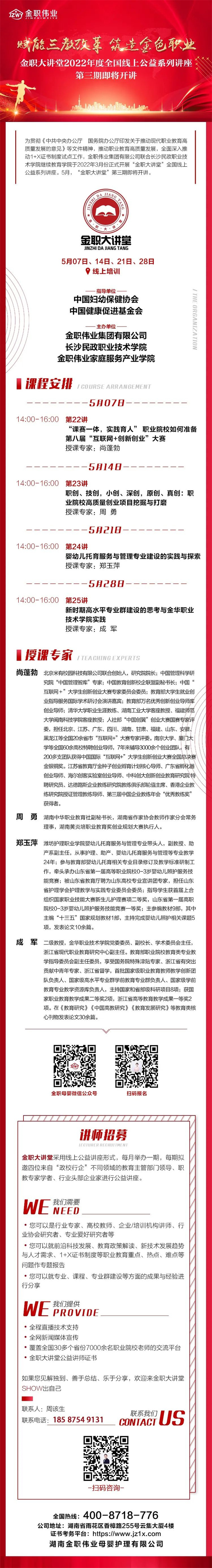 金職大講堂采用線上公益講座形式,每月舉辦一期,每期擬邀四位來自“政校行企”不同領域的教育主管部門領導、職教專家學者、行業頭部企業家進行公益講座。