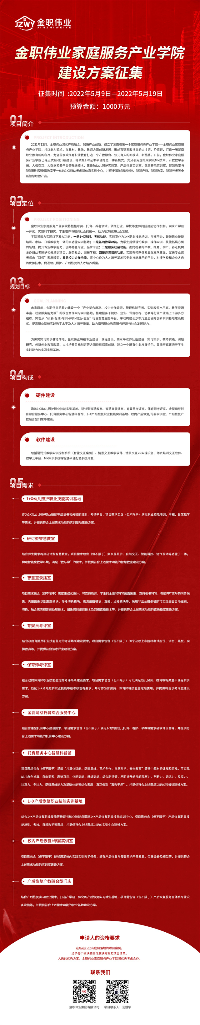 此次方案征集將于5月19日24時截止,期望社會各界有著豐富經(jīng)驗及成熟落地項目案例的專家能積極參與,給予每個模塊具體解決方案及項目清單,入選的優(yōu)秀方案,金職偉業(yè)家庭服務產(chǎn)業(yè)學院將優(yōu)先考慮合作。