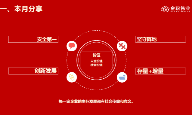 員工作為金職偉業這個大家庭的一份子,更應關注公司的安全,每日下班檢查工位斷電情況,排查安全隱患,做到平安上下班;學員培訓放學后教務老師及相關責任人也應再次檢查教室,實訓室等,確保無安全隱患存在;學員宿舍,員工宿舍用水用電安全定要再三強調,不用違規電器,不將易燃易爆物品靠近火源,避免悲劇發生;公司車輛使用結束后要及時熄火,檢查車輛有無損壞,定期送修。安全無小事,安全大于天,安全,是企業奮斗的第一門檻。