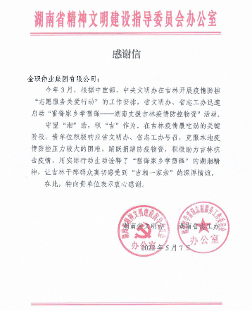 湖南省精神文明建設指導委員會辦公室發來感謝信,點贊金職偉業馳援吉林抗疫