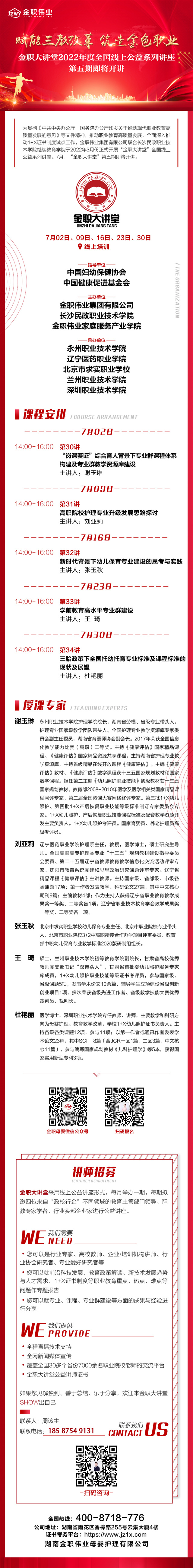 7月2日,金職大講堂將開啟第五期第30講,此次課程邀請了永州職業技術學院護理學院院長謝玉琳教授就《“崗課賽證”綜合育人背景下專業群課程體系構建及專業群教學資源庫建設》進行主題授課。屆時,誠邀各位行業專家、院校老師共同參加與聆聽~