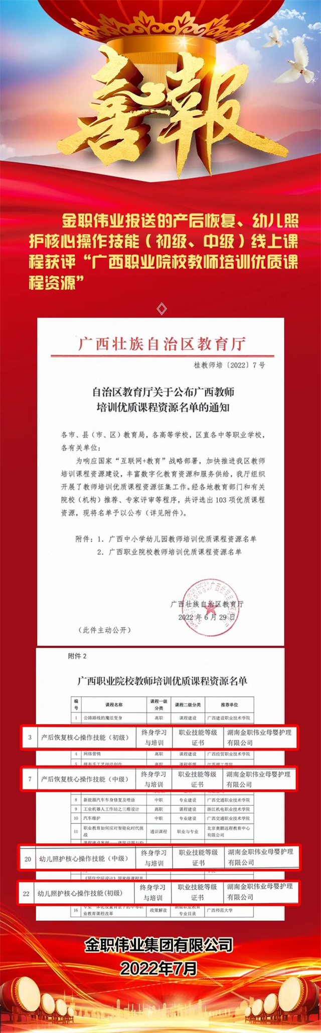 1.喜訊|金職偉業報送的產后恢復、幼兒照護核心操作技能(初級、中級)線上課程獲評廣西壯族自治區省級職業院校教師培訓優質課程資源