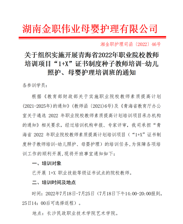 1.(湘金職護理司函〔2022〕46號)關于組織青海2022職業院校教師培訓項目1+X證書制度種子教師培訓幼兒照護、母嬰護理培訓通知