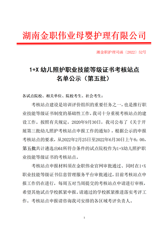 2.(湘金職護理司函〔2022〕52號)1+X幼兒照護職業技能等級證書考核站點名單公示(第五批)
