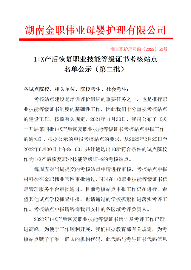 3.(湘金職護理司函〔2022〕53號)1+X產后恢復職業技能等級證書考核站點名單公示(第二批)