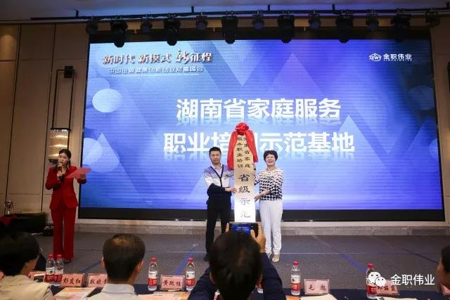 會上,湖南省就業服務局農村就業處主任毛彪先生為湖南金職偉業公司頒發了“湖南省家庭服務職業培訓示范基地”榮譽牌匾,金職偉業董事長彭英女士上臺接受牌匾。