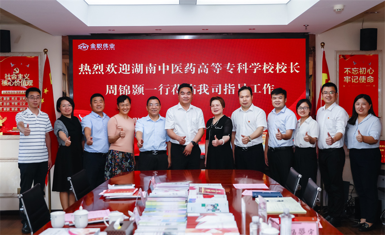 9月2日,湖南中醫藥高等專科學校校長周錦顥帶隊到長沙,與金職偉業集團有限公司舉行校企合作洽談會,雙方就如何進一步深化校企合作,促進產教融合、協同育人展開交流討論。