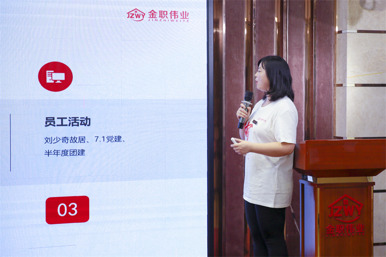 會議伊始,金職偉業集團董事長彭英女士發表致辭。她首先對上半年公司發展情況進行了總結,并就“做強存量、做大增量”兩點,對各部門今后工作方向與重點做了詳細部署。“宏觀經濟形勢艱難,微觀商業活力虛弱的背景下,金職偉業更應該固根基、揚優勢、補短板,以扎實的功底實現新突破。”彭英董事長希望,所有金職人都能不忘初心、凝心聚力,在接下來的工作中腳踏實地,完成年度目標。