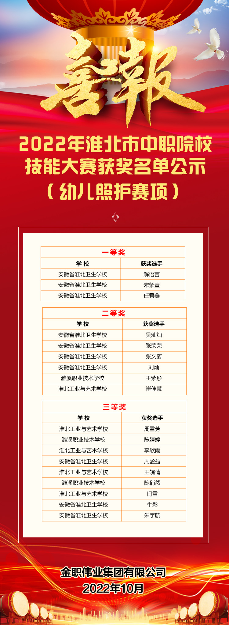 近日,2022年淮北市中等職業院校學生技能大賽(幼兒照護賽項)在安徽省淮北衛生學校圓滿落幕,此次大賽由淮北市教育局、經信局、人社局主辦,安徽省淮北衛生學校承辦,湖南金職偉業母嬰護理有限公司等單位協辦。