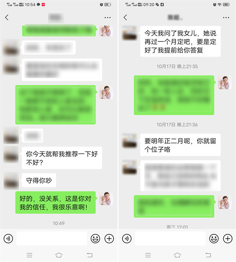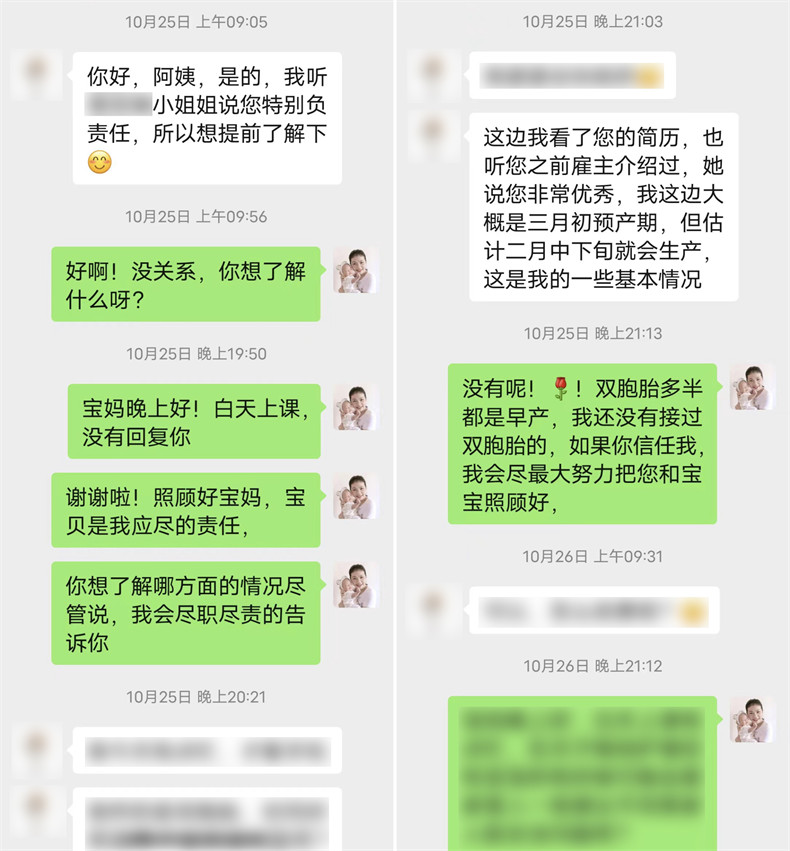 “之前有一位客戶,是個年輕的媽媽,沒有婆婆、沒有媽媽,只有我幫忙帶寶寶,寶媽就很依賴我,把我當成婆婆、媽媽,我能感覺到,她也在真正地把我當家人。服務結束后,她也給我介紹了新的客戶。”