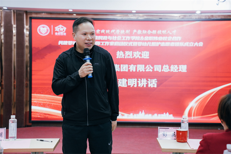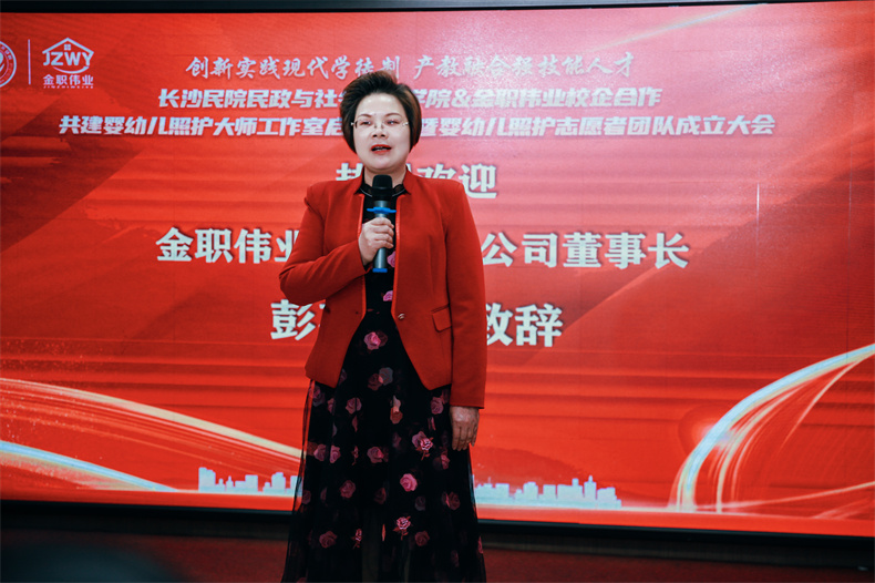 隨后,金職偉業(yè)董事長彭英以“四個優(yōu)勢”“五個保障”,對嬰幼兒照護大師工作室發(fā)展提出了具體要求,“我們有一流的團隊和一流的技術(shù),要打造一流的品質(zhì)和一流的服務(wù);我們將全力為大師工作室提供經(jīng)費、場地、設(shè)備、活動保障,更期望獲得質(zhì)量與成果保障。”“大師工作室的成員應(yīng)腳踏實地、真抓實干,共同推動大師工作室做深做實,做出成果、做成標(biāo)桿,幫助學(xué)生在行業(yè)中創(chuàng)造更多價值。”