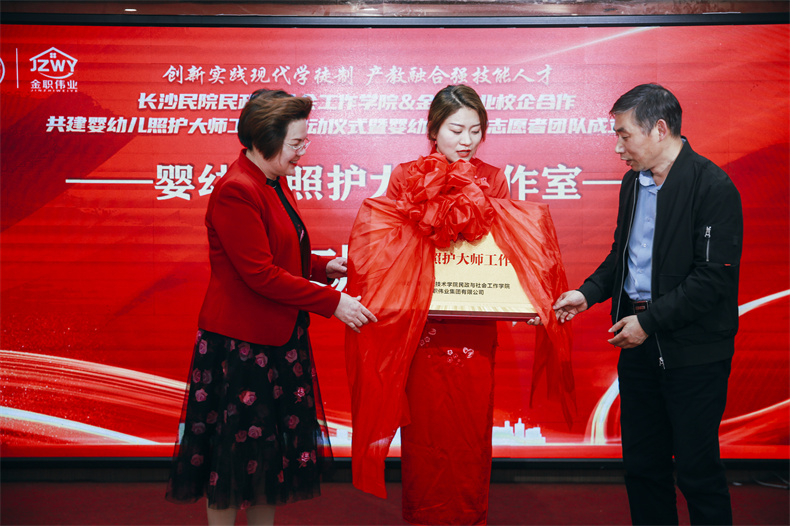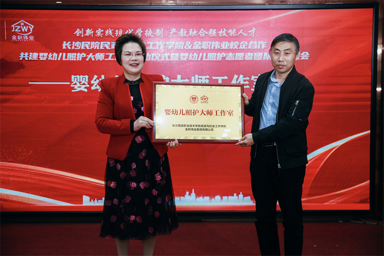 在沈宏格副院長、彭英董事長的共同揭牌下,“嬰幼兒照護大師工作室”正式成立。其成立不僅是金職偉業(yè)與長沙民政職業(yè)技術(shù)學(xué)院進一步深化校企合作、產(chǎn)教融合的有效途徑,也是教師能力提升、學(xué)生實踐學(xué)習(xí)、企業(yè)創(chuàng)新發(fā)展的重要平臺。