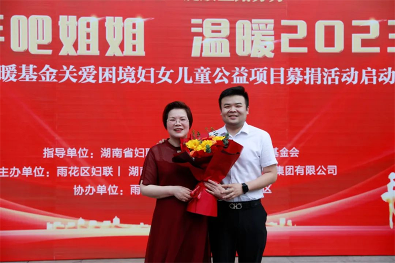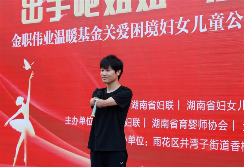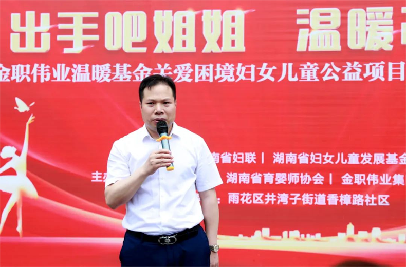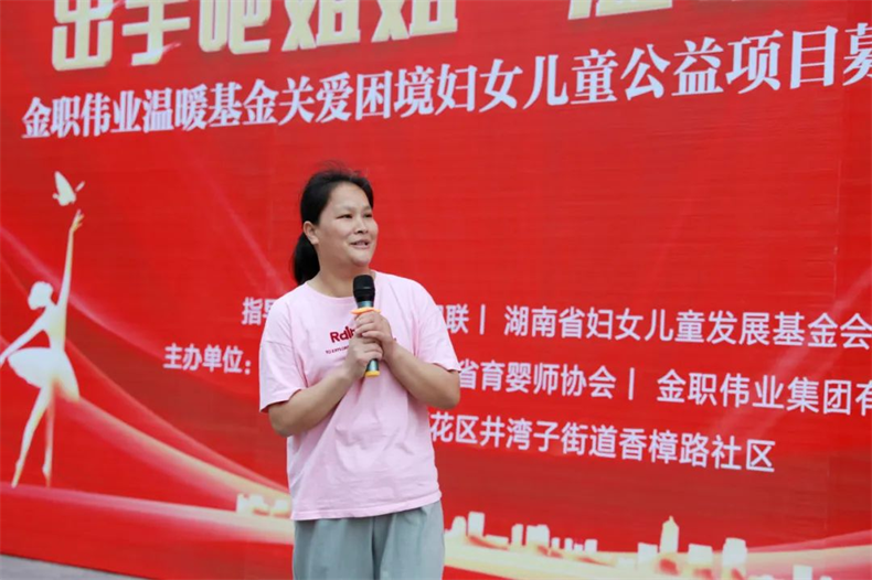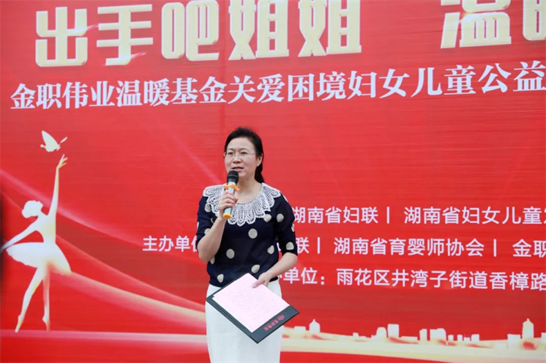啟動(dòng)儀式上,彭英講述了自己學(xué)生時(shí)代,隔壁叔叔每個(gè)月給2塊錢作助學(xué)金,在讀書時(shí)候也一直受到村里和學(xué)校的幫助,讓她完成學(xué)業(yè)的故事。早年受到的善意就像一束光,不僅照亮了彭英成長(zhǎng)的道路,也讓她成為“撐傘的人”,從開始創(chuàng)業(yè)到做公益,一直堅(jiān)守初心,堅(jiān)守承諾:“金職偉業(yè)籌集到的所有愛心善款,都盡數(shù)捐贈(zèng)給湖南省婦女兒童發(fā)展基金會(huì),用于幫扶困境婦女兒童,特別是孤殘兒童,留守兒童幫扶中。”致辭中,她希望更多的愛心人士加入,以小愛匯大流,幫助更多的婦女兒童走出生活的困境!