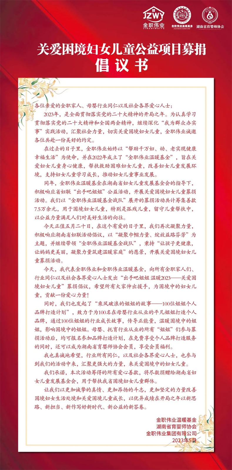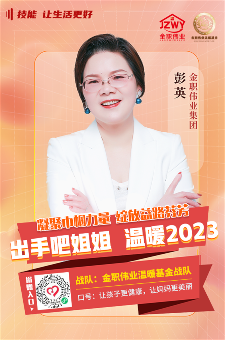 2023年,為積極響應(yīng)湖南省婦女聯(lián)合會(huì)活動(dòng)倡議,彭英將繼續(xù)帶領(lǐng)“金職偉業(yè)溫暖基金戰(zhàn)隊(duì)”,以“讓孩子更健康,讓媽媽更美麗”為口號(hào),舉辦關(guān)愛困境婦女兒童系列活動(dòng),旨在匯聚社會(huì)力量,切實(shí)關(guān)愛困境婦女兒童。活動(dòng)籌得的所有愛心善款,將盡數(shù)捐贈(zèng)給湖南省婦女兒童發(fā)展基金會(huì),用于幫扶我省困境婦女兒童群體。