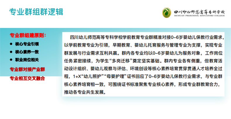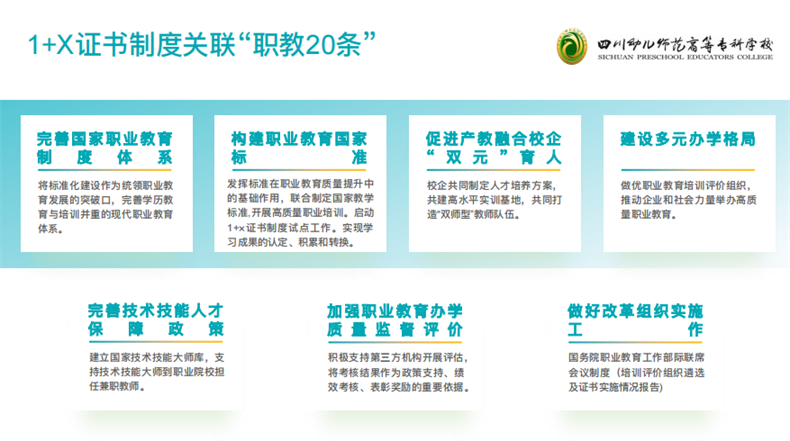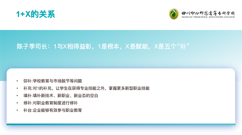“職業教育作為類型教育,在培養目標、課程體系、育人方式等方面與普通教育有著明顯區別,必須遵循技術技能人才的培養規律,進一步解放思想、更新理念,鞏固和堅持職業教育的類型定位。”隨后,景春教授以四川幼兒師范高等專科學校學前教育專業群為例,對1+X證書制度背景下,“課證融通”的專業群課程體系構建展開了詳細講解。