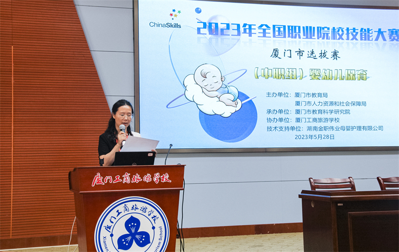 5月28日,2023年全國職業院校技能大賽中職組“嬰幼兒保育”賽項廈門選拔賽在廈門工商旅游學校順利開幕,來自廈門市3所中職院校的12支代表隊,共計24名選手同臺競技、各展風采。此次大賽由廈門市教育局、廈門市人力資源和社會保障局主辦,廈門市教育科學研究院承辦,廈門工商旅游學校協辦,湖南金職偉業母嬰護理有限公司提供技術支持,旨在實現以賽促建、以賽促教、以賽促學,提升學生適崗綜合能力,全力推進幼兒保育專業高素質技能人才培養工作。
