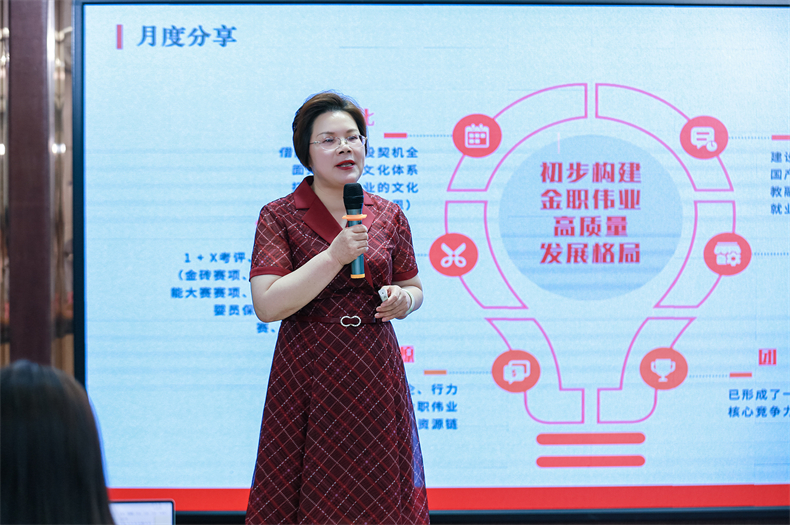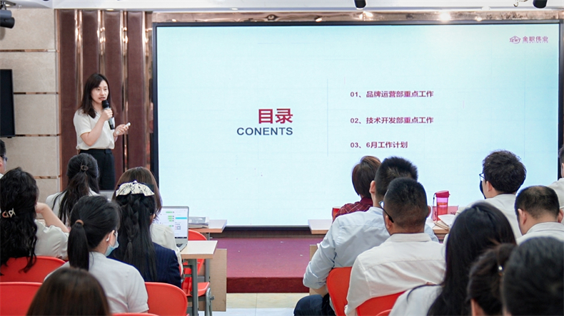 隨后,她對四、五月份的工作完成情況給予了肯定,并明確了6月工作目標及工作重點,“在公司高速發(fā)展的當下,金職偉業(yè)緊跟家庭服務行業(yè)的政策導向,以1+X考評、人社考評和大賽為抓手,以家庭服務產業(yè)學院為平臺,以教材資源、智慧教育產品、服務產品為推手,聯動政、校、企、行力量,構建一條金職偉業(yè)優(yōu)勢資源鏈”,同時,隨著新成員的源源加入,老金職人作為中堅力量,要擔負起“傳幫帶”的職責和使命,不斷提升團隊凝聚力和戰(zhàn)斗力;最后,彭英董事長還強調了金職人要打好“開源節(jié)流”組合拳,助推企業(yè)精益管理再升級。