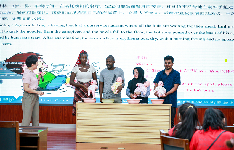 據(jù)了解,此次培訓(xùn)依托廣西教育科學(xué)重點(diǎn)研究基地——中國(guó)—東盟學(xué)前教育高素質(zhì)技術(shù)技能領(lǐng)軍人才創(chuàng)新培養(yǎng)基地,面向泰國(guó)、馬來(lái)西亞、新加坡等東南亞聯(lián)盟國(guó)家學(xué)子開(kāi)展,培訓(xùn)內(nèi)容涵蓋海姆立克急救技術(shù)、燙傷初步處理、語(yǔ)言發(fā)展與指導(dǎo)、社會(huì)性發(fā)展與指導(dǎo)等1+X幼兒照護(hù)職業(yè)技能等級(jí)證書(shū)核心技能,致力于面向東盟開(kāi)展學(xué)前教育高素質(zhì)技術(shù)技能領(lǐng)軍人才培養(yǎng),促進(jìn)當(dāng)?shù)貙W(xué)前教育人才培育水平提升。6月29日,為期兩天的培訓(xùn)結(jié)束,各參訓(xùn)學(xué)員還參加了1+X幼兒照護(hù)證書(shū)考試,以切實(shí)檢驗(yàn)培訓(xùn)成果,賦能自身未來(lái)發(fā)展。