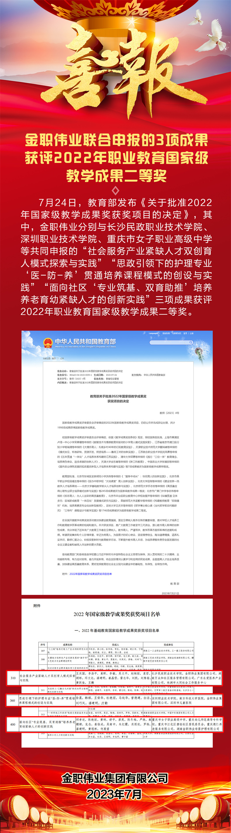 7月24日,教育部發(fā)布《關(guān)于批準2022年國家級教學成果獎獲獎項目的決定》,其中,金職偉業(yè)分別與長沙民政職業(yè)技術(shù)學院、深圳職業(yè)技術(shù)學院、重慶市女子職業(yè)高級中學等共同申報的“社會服務產(chǎn)業(yè)緊缺人才雙創(chuàng)育人模式探索與實踐”“思政引領(lǐng)下的護理專業(yè)‘醫(yī)-防-養(yǎng)’貫通培養(yǎng)課程模式的創(chuàng)設與實踐”“面向社區(qū)‘專業(yè)筑基、雙育助推’培養(yǎng)養(yǎng)老育幼緊缺人才的創(chuàng)新實踐”三項成果獲評2022年職業(yè)教育國家級教學成果二等獎。