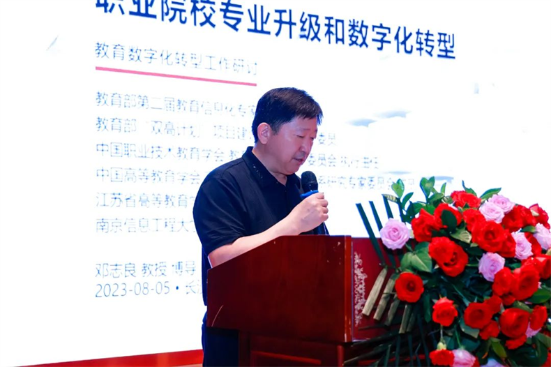 鄧志良作《職業院校專業升級和數字化轉型》主題分享,他談到,時代變化發展,提出了更多要求,需要我們加強自身技能,迎接挑戰。“黨的二十大報告提出,推進教育數字化,建設全民終身學習的學習型社會、學習型大國。”他提出,時代飛速發展,職業院校應主動進行專業轉型,扶持新興專業、改造傳統專業、支持重點專業、強化優勢專業和調減劣勢專業。同時修訂人才培養方案,打造專業建設平臺,改革課堂教學模式、提升整體教學能力、重構教學質量保障體系、抓住機遇,迎接挑戰。