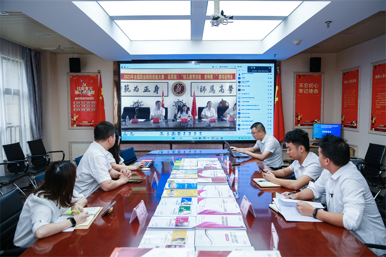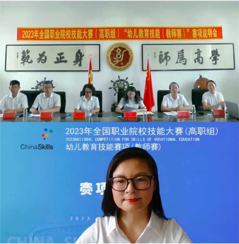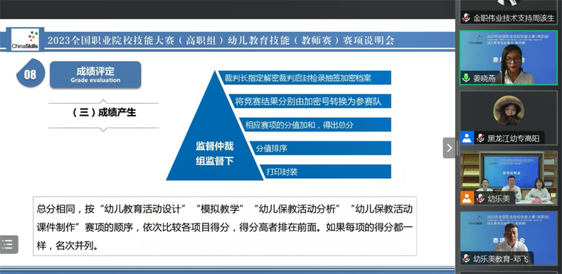 8月14日,2023年全國職業(yè)院校技能大賽(高職組)幼兒教育技能賽項(教師賽)說明會云端舉行,來自全國各地50多所參賽院校的領(lǐng)隊及參賽選手,賽項專家組成員,承辦校及賽項技術(shù)支持單位代表一百余人共同參會。作為賽項技術(shù)支持企業(yè),金職偉業(yè)集團有限公司受邀參會,并進行賽項技術(shù)平臺說明。