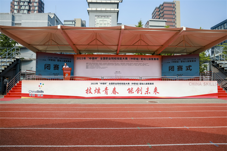 9月16日上午,2023年“中銀杯”全國職業院校技能大賽(中職組)嬰幼兒保育賽項閉賽式在北京市求實職業學校望京校區舉行。教育部職成司繼續教育處干部姜福佳、賽區組織委員會委員賽區執行委員會主任王福海、教育部職業院校教育類專業教學指導委員會主任劉蘭明、北京市朝陽區教育委員會副主任賽項執行委員會主任徐志輝、賽項專家組組長曹紅玲、賽項裁判長馬海峰、賽項監督仲裁長李嫦、北京市朝陽區教育委員會職業教育與成人教育科科長賽項執行委員會委員郭伶俐、賽區執行委員會委員楊永杰、朝陽區教育科學研究院職成教研部陳清、金職偉業集團有限公司總經理助理兼院校事業部總監周該生等領導專家出席閉賽式。