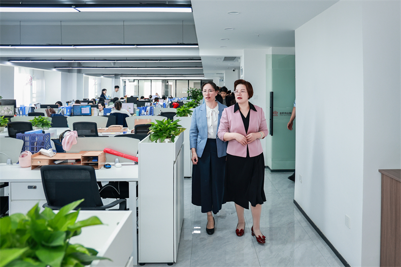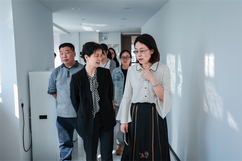 長沙民政職業技術學院教學副校長劉亞琴一行實地參觀了新建成啟用的共同體秘書處、共同體辦公室、共同體成果展廳、就業實踐中心及智能娃娃生產基地,詳細了解了共同體實體化運行機制及辦公場地規劃。