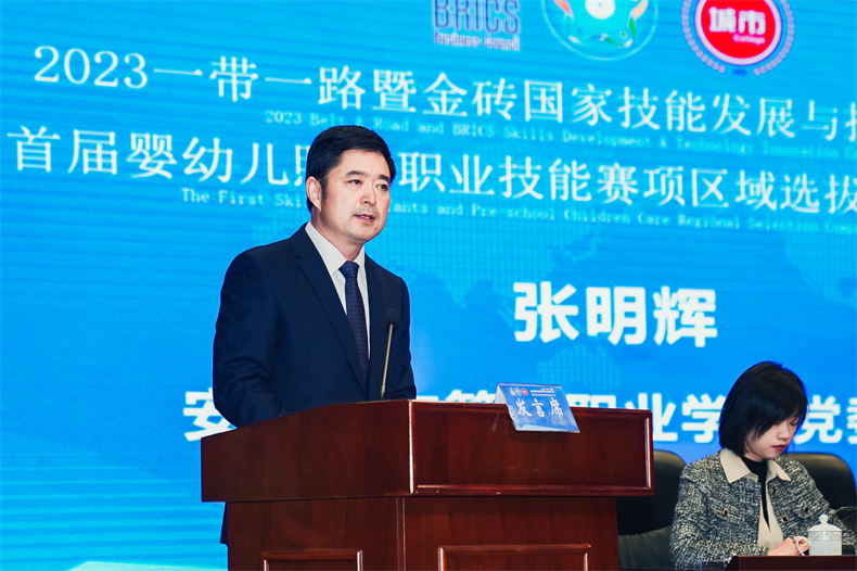 11月10日,2023一帶一路暨金磚國(guó)家技能發(fā)展與技術(shù)創(chuàng)新大賽首屆嬰幼兒照護(hù)職業(yè)技能賽項(xiàng)區(qū)域選拔賽(第十場(chǎng))在安徽城市管理職業(yè)學(xué)院正式開賽。金磚國(guó)家技能發(fā)展與技術(shù)創(chuàng)新大賽組委執(zhí)委會(huì)副主席何勇,安徽職業(yè)技術(shù)學(xué)院黨委副書記、院長(zhǎng)盛鵬,安徽城市管理職業(yè)學(xué)院黨委書記張明輝,黨委副書記、院長(zhǎng)劉瑾,金職偉業(yè)集團(tuán)有限公司董事長(zhǎng)彭英,賽項(xiàng)裁判長(zhǎng)丁揚(yáng),賽項(xiàng)仲裁長(zhǎng)田奇恒等專家、領(lǐng)導(dǎo)出席開幕式,安徽城市管理職業(yè)學(xué)院黨委副書記、院長(zhǎng)劉瑾主持儀式。
