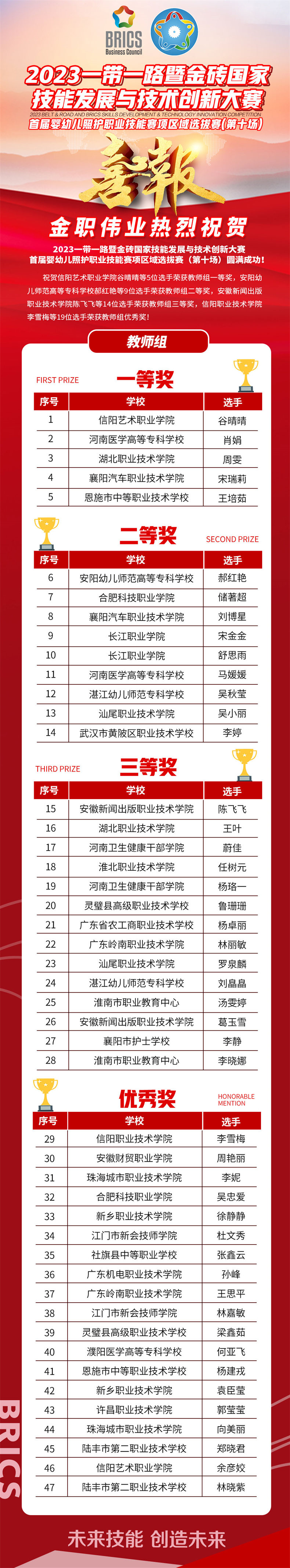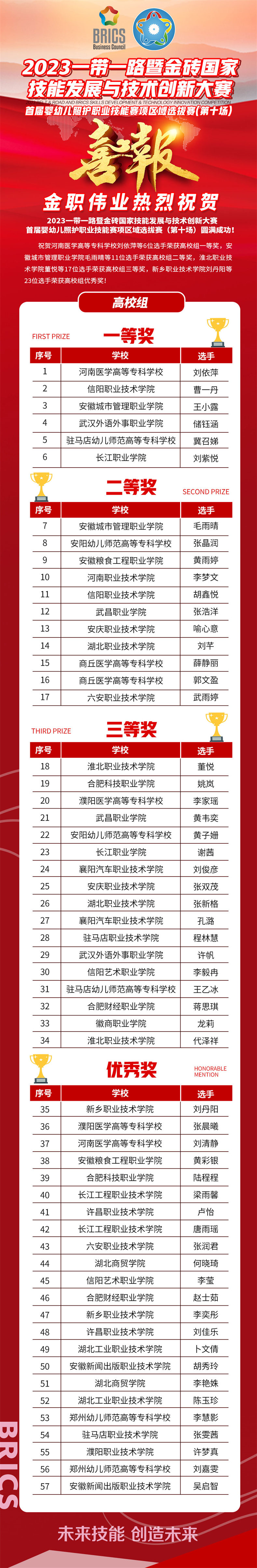 最終,河南醫(yī)學高等專科學校劉依萍等6位選手榮獲高校組一等獎,安徽城市管理職業(yè)學院毛雨晴等11位選手榮獲高校組二等獎,淮北職業(yè)技術(shù)學院董悅等17位選手榮獲高校組三等獎,新鄉(xiāng)職業(yè)技術(shù)學院劉丹陽等23位選手榮獲高校組優(yōu)秀獎;信陽藝術(shù)職業(yè)學院谷晴晴等5位選手榮獲教師組一等獎,安陽幼兒師范高等專科學校郝紅艷等9位選手榮獲教師組二等獎,安徽新聞出版職業(yè)技術(shù)學院陳飛飛等14位選手榮獲教師組三等獎,信陽職業(yè)技術(shù)學院李雪梅等19位選手榮獲教師組優(yōu)秀獎。(詳細名單見文后)