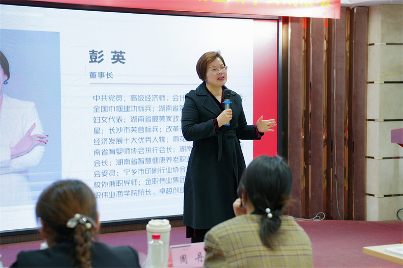 金職偉業(yè)董事長彭英對大家的到來表示熱烈歡迎,她談到,此次訪企研學(xué)活動(dòng),進(jìn)一步拉近了校企的距離,促進(jìn)了校企更深層次的交流溝通。她提到,“一老一小”是關(guān)系保障和改善民生、促進(jìn)國家長治久安、增強(qiáng)大國發(fā)展韌性的大事。現(xiàn)今,人口老齡化趨勢顯著、嬰幼兒出生率逐漸下降,家庭服務(wù)領(lǐng)域人才已成為國家緊缺人才,家庭服務(wù)領(lǐng)域行業(yè)擁有廣闊的市場前景。“人才是第一資源,創(chuàng)新是第一動(dòng)力,人才的進(jìn)入對企業(yè)發(fā)展意義重大,期待在座各位來金職偉業(yè)學(xué)習(xí)實(shí)踐,為自身發(fā)展賦能。”