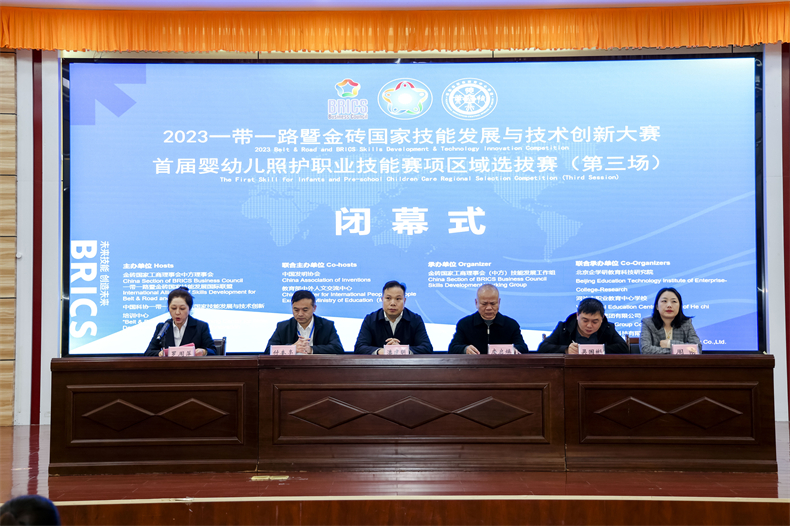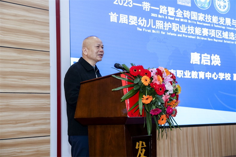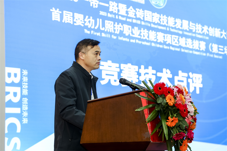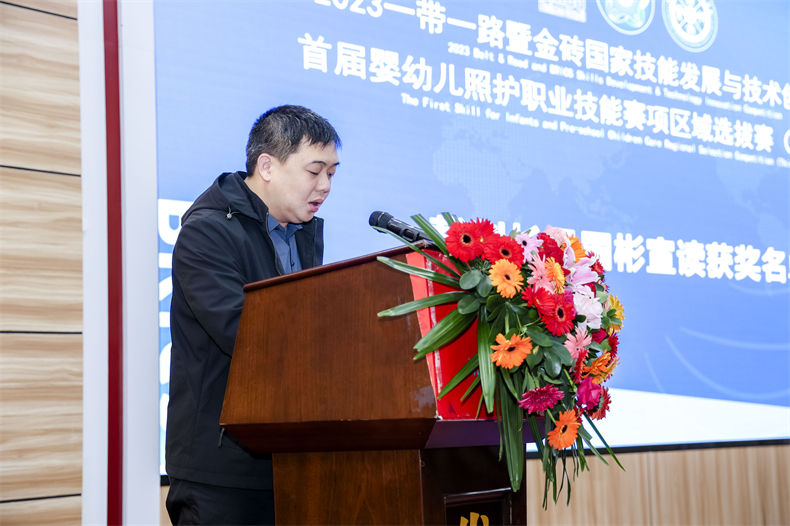 11月17日,2023一帶一路暨金磚國家技能發展與技術創新大賽首屆嬰幼兒照護職業技能賽項區域選拔賽(第三場)在河池市職業教育中心學校圓滿結束,河池市職業教育中心學校副校長唐啟煥、金職偉業集團有限公司總經理潘建明、賽項專家組長付奎亮、賽項裁判長吳國彬、賽項仲裁長周密等專家、領導出席閉幕式,河池市職業教育中心學校民族文化藝術教學部主任羅周萍主持儀式。