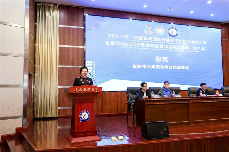 隨后,金職偉業集團有限公司董事長彭英從金磚大賽的戰略意義、賽項立項初心、金職偉業未來發展方向三方面進行講話。她談到,“矗立在職教改革的風口,金職人與時間賽跑,不舍晝夜,路雖遠,行則將至,事雖難,做則必成!讓我們共同深化嬰幼兒照護技術技能人才培養,將其打造成為金磚國家共同的技術技能發展創新成果,推動我國的幼兒照護走出國門,走向世界。”至此,金職偉業集團有限公司董事長彭英宣布2023一帶一路暨金磚國家技能發展與技術創新大賽首屆嬰幼兒照護職業技能賽項區域選拔賽(第八場),正式開幕。