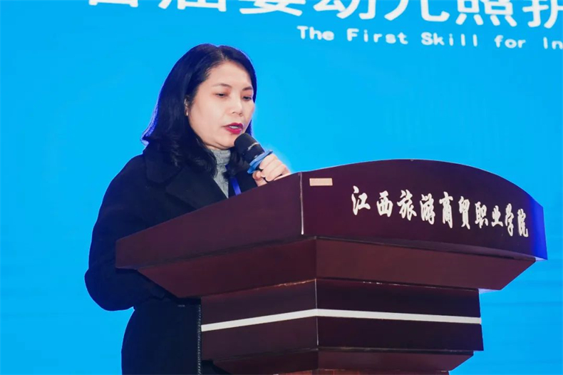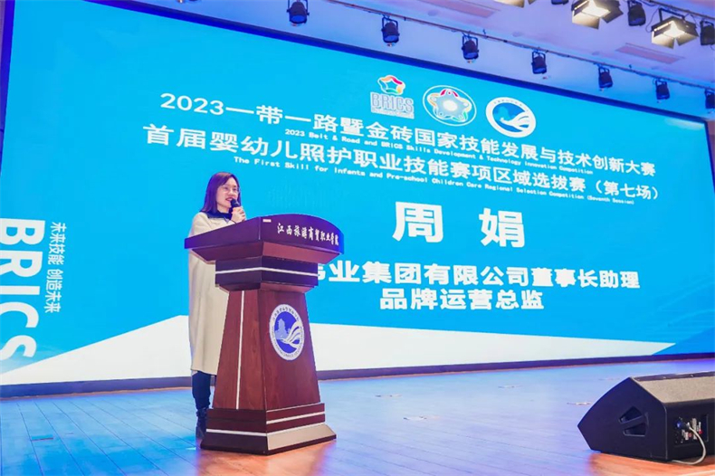 金職偉業集團有限公司董事長助理兼品牌運營總監周娟致辭,她對賽事的成功舉辦,選手獲得的優異成績表示熱烈祝賀,對付出辛勤勞動的全體領導、專家、裁判員、領隊、選手、志愿者等賽事支持人員表示敬意及感謝。她提到,“江西旅游商貿職業學院承辦的金磚大賽首屆嬰幼兒照護職業技能賽項第七場區域選拔賽是一場精彩、圓滿的競技盛會,是對嬰幼兒照護相關專業學生專業技能的一次大檢閱,是職業院校師生交流經驗、切磋技藝、發現人才的一個優質平臺。”