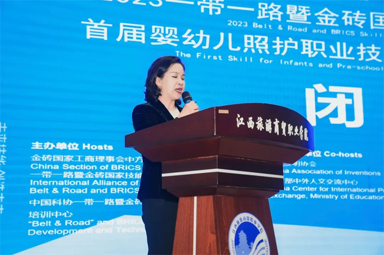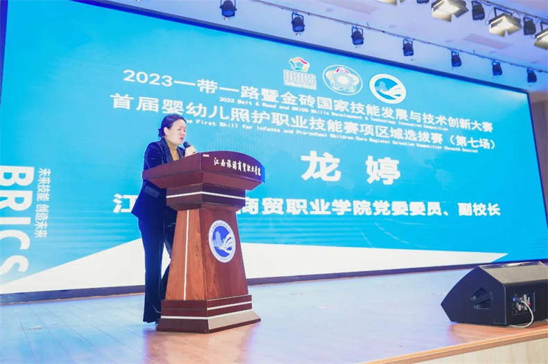 江西旅游商貿職業學院黨委委員、副校長龍婷進行總結講話。她總結了賽事背景、競賽隊伍、競賽各階段情況、賽事意義。她提到,大賽以“未來技能 創造未來”為愿景,已成功舉辦六屆,也成為了推動金磚國家間教育合作、技能開發和人文交流活動的重要平臺。“我校將充分發揮大賽的引領作用,不斷深化三教改革,培養更多高素質人才,助推嬰幼兒照護事業的高質量發展。”