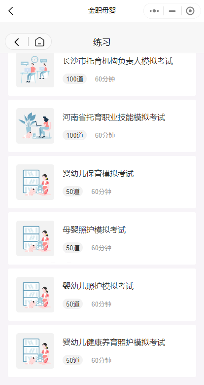 為拓展技能人才培養渠道,大力培育高素質技能型人才,近日,金職偉業結合自身企業優勢,聯動幼兒照護領域行業專家,完成了嬰幼兒保育、母嬰照護、嬰幼兒照護、嬰幼兒健康養育四大職業技能理論題庫開發工作,并于“金職母嬰”小程序正式上線,用戶登錄小程序,進入“練習”模塊,即可在線免費練題。
