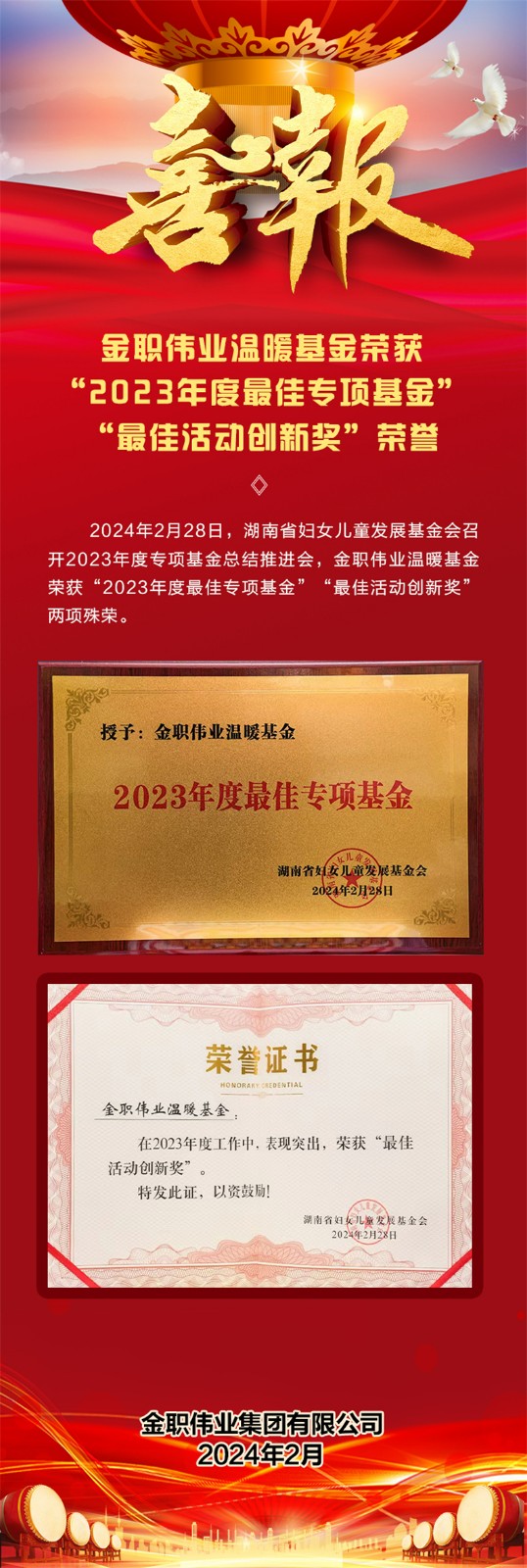 此次會議設立5個獎項,對2023年度工作中表現優異的13個專項基金進行表彰,金職偉業溫暖基金榮獲“2023年度最佳專項基金”“最佳活動創新獎”兩項殊榮。