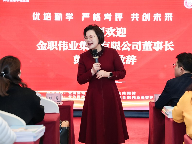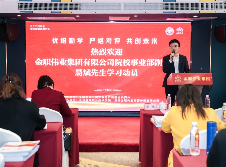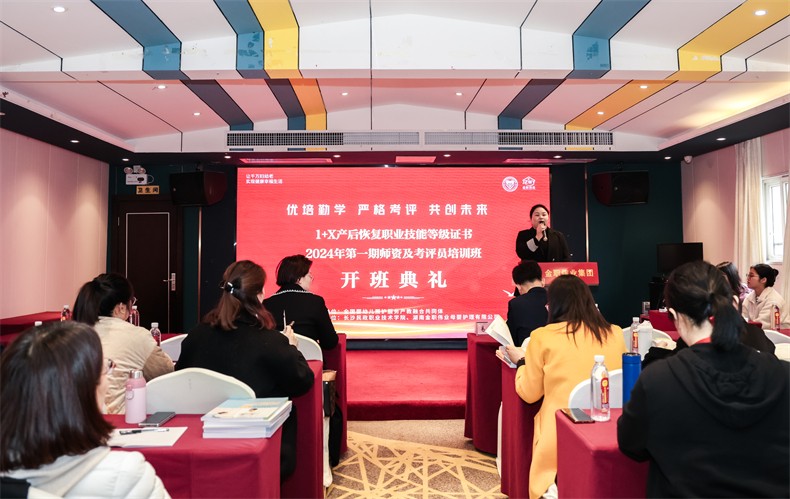為貫徹落實國家職業教育改革方案,深入推進1+X證書工作,切實提高教師教學能力,3月14日,1+X產后恢復職業技能等級證書2024年首期師資及考評員培訓班在湖南長沙正式開班,金職偉業集團有限公司(以下簡稱“金職偉業”)董事長彭英、院校事業部副總監易斌出席開班典禮并講話。