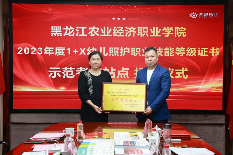 會(huì)議最后,金職偉業(yè)集團(tuán)授予黑龍江農(nóng)業(yè)經(jīng)濟(jì)職業(yè)學(xué)院“2023年度1+X幼兒照護(hù)職業(yè)技能等級(jí)證書示范考核站點(diǎn)”牌匾,以表彰學(xué)校在1+X幼兒照護(hù)證書方面的工作成果。雙方表示,下一步將整合雙方資源,發(fā)揮各自優(yōu)勢(shì),以1+X幼兒照護(hù)證書為抓手,提高畢業(yè)生就業(yè)競爭力,增強(qiáng)社會(huì)服務(wù)能力。