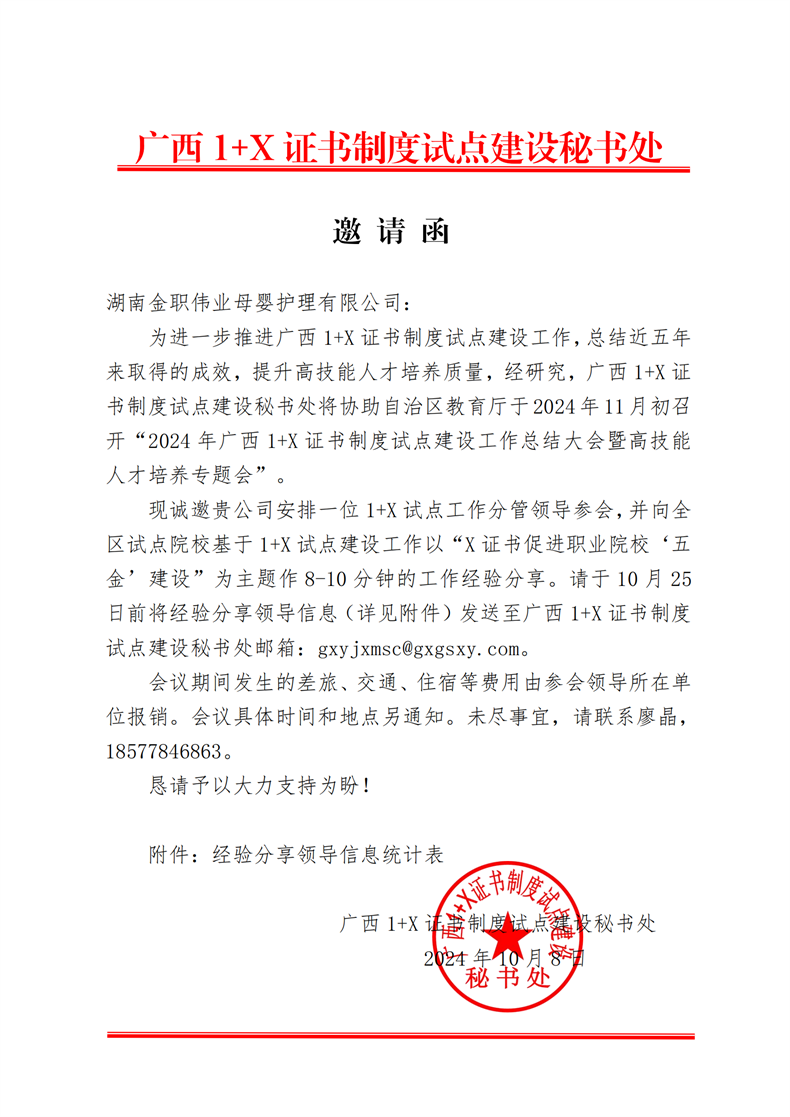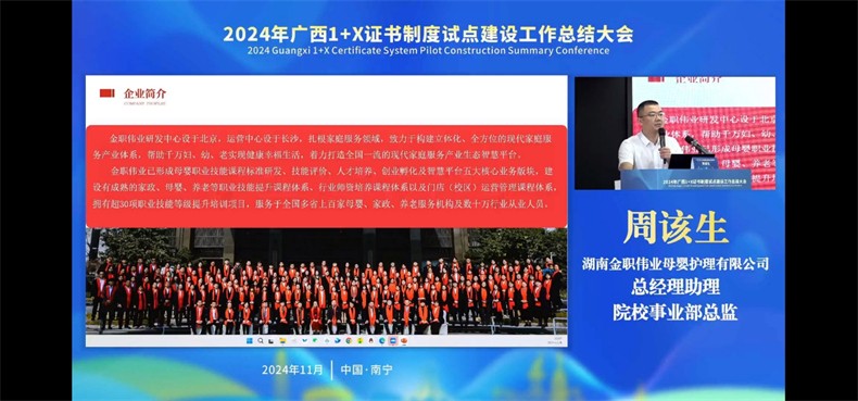11月8日,由廣西壯族自治區(qū)教育廳主辦、廣西1+X證書制度試點(diǎn)建設(shè)秘書處、廣西工商職業(yè)技術(shù)學(xué)院承辦的2024年廣西1+X證書制度試點(diǎn)建設(shè)工作總結(jié)大會(huì)在南寧召開。此次會(huì)議旨在總結(jié)廣西1+X證書制度試點(diǎn)建設(shè)工作經(jīng)驗(yàn),助力廣西職業(yè)教育改革與發(fā)展,作為1+X證書制度試點(diǎn)第三批、第四批幼兒照護(hù)、產(chǎn)后恢復(fù)職業(yè)技能等級(jí)證書職業(yè)教育培訓(xùn)評(píng)價(jià)組織,湖南金職偉業(yè)母嬰護(hù)理有限公司總經(jīng)理助理兼院校事業(yè)部總監(jiān)周該生受邀參會(huì)并作分享。
